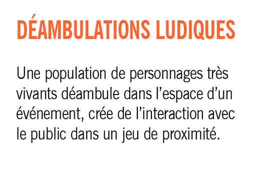 Interventions événementielles, développement des personnes, programmation de ses spectacles ou créations sur mesure, la palette offerte par ce champ d'exploration est large et en voici quelques exemples :