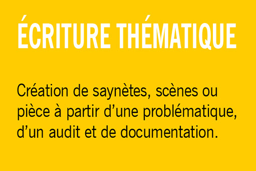 L’écriture thématique se fait d’après une analyse des désirs, des besoins et des problématiques. Elle est porteuse de sens et de libération. Le ton et le traitement proposés amènent recul et distance et permettent d’aborder les sujets les plus difficiles.