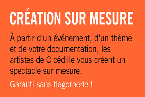 Fait par des citoyens d'aujourd'hui, pour un public de citoyens du même temps, le théâtre proposé par C cédille est le fruit du lieu et de l'instant qui lui voient prendre vie. Les artistes et techniciens qui collaborent aux créations ne vivent pas isolés de leurs contemporains, dans une mythique sphère éthérée en compagnie des muses. Ils existent dans le quotidien construit par notre société, mais y portent l'acuité de leur regard et de leur sensibilité, qu'ils offrent en partage à leurs concitoyens. Le théâtre de C cédille se joue partout et prend de multiples formes pour parler de tout, jamais n'importe comment.