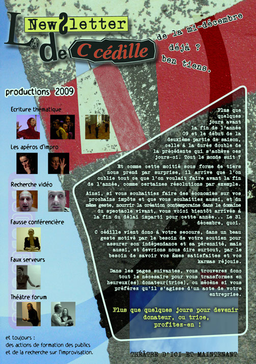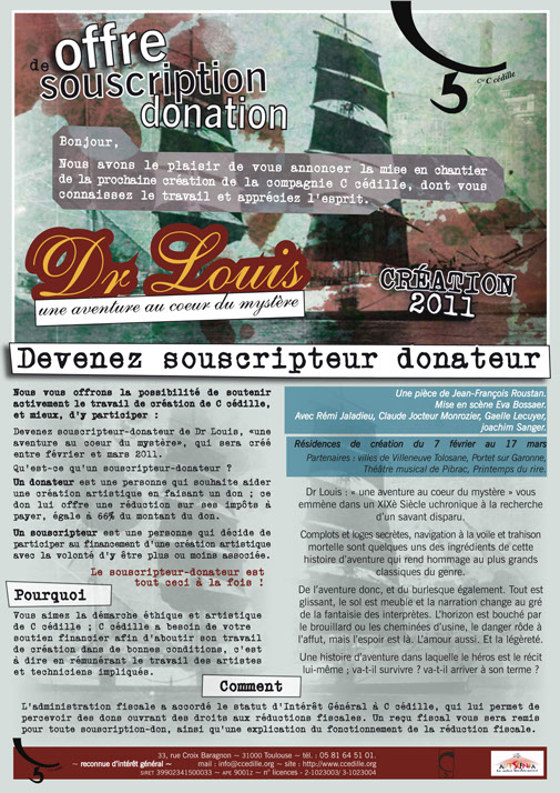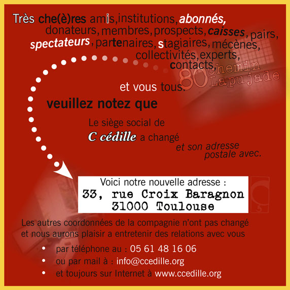 Fait par des citoyens d'aujourd'hui, pour un public de citoyens du même temps, le théâtre proposé par C cédille est le fruit du lieu et de l'instant qui lui voient prendre vie. Les artistes et techniciens qui collaborent aux créations ne vivent pas isolés de leurs contemporains, dans une mythique sphère éthérée en compagnie des muses. Ils existent dans le quotidien construit par notre société, mais y portent l'acuité de leur regard et de leur sensibilité, qu'ils offrent en partage à leurs concitoyens. Le théâtre de C cédille se joue partout et prend de multiples formes pour parler de tout, jamais n'importe comment.