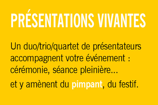 Interventions événementielles, développement des personnes, programmation de ses spectacles ou créations sur mesure, la palette offerte par ce champ d'exploration est large et en voici quelques exemples :