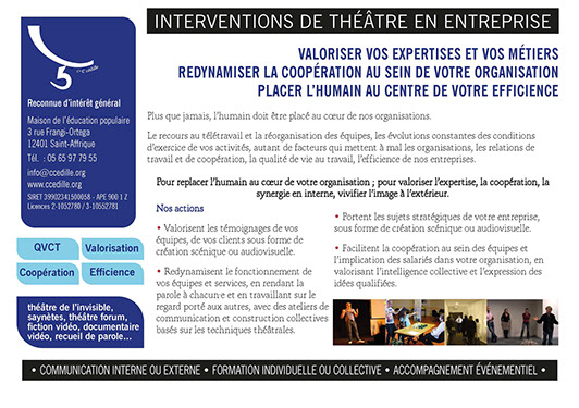 C cédille s'est spécialisée dans les interventions de théâtre en entreprise, qu'elle pratique depuis sa création. Elle a pu collaborer avec les structures Sur mesure et Agouti productions.